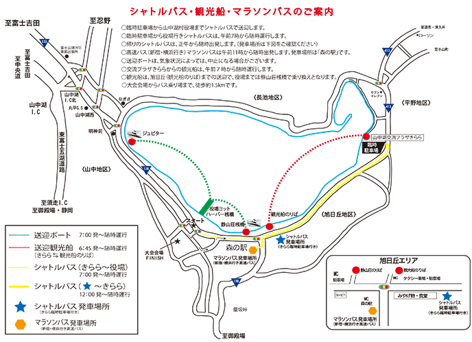 山中湖畔駐車場の最寄りの桟橋及び旭日丘湖畔の桟橋より選手・家族・大会関係者をモーターボートにて、大会会場近くの 桟橋まで無料にて送迎を行います。